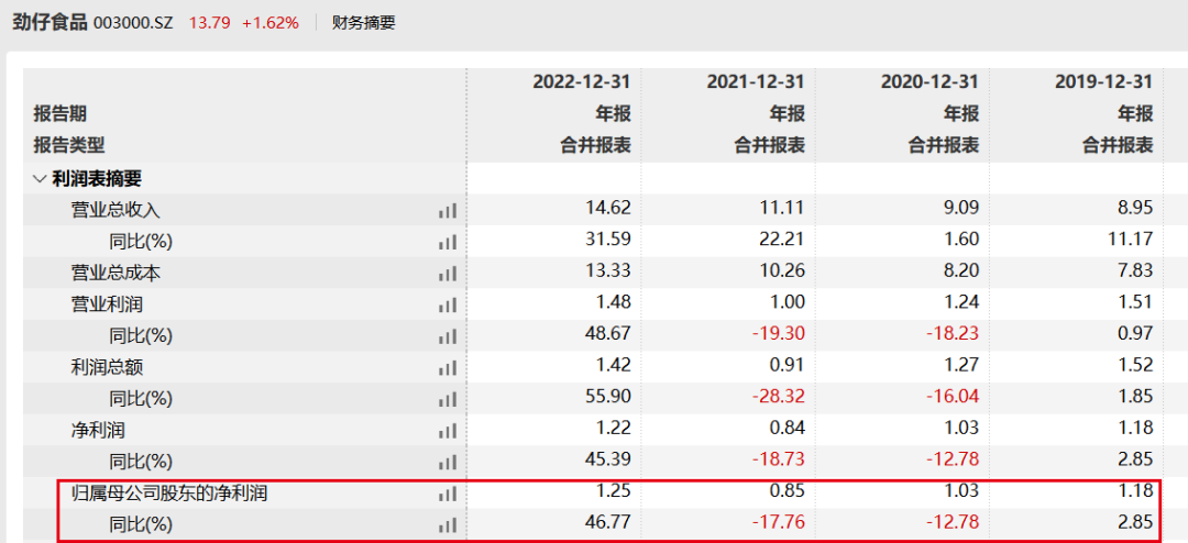 Wind数据显示,2019年-2022年,劲仔食品的归母净利润分别为1.18亿元、1.03亿元、0.85亿元和1.25亿元,增速分别为2.85%、-12.78%、-17.76%和46.77%。