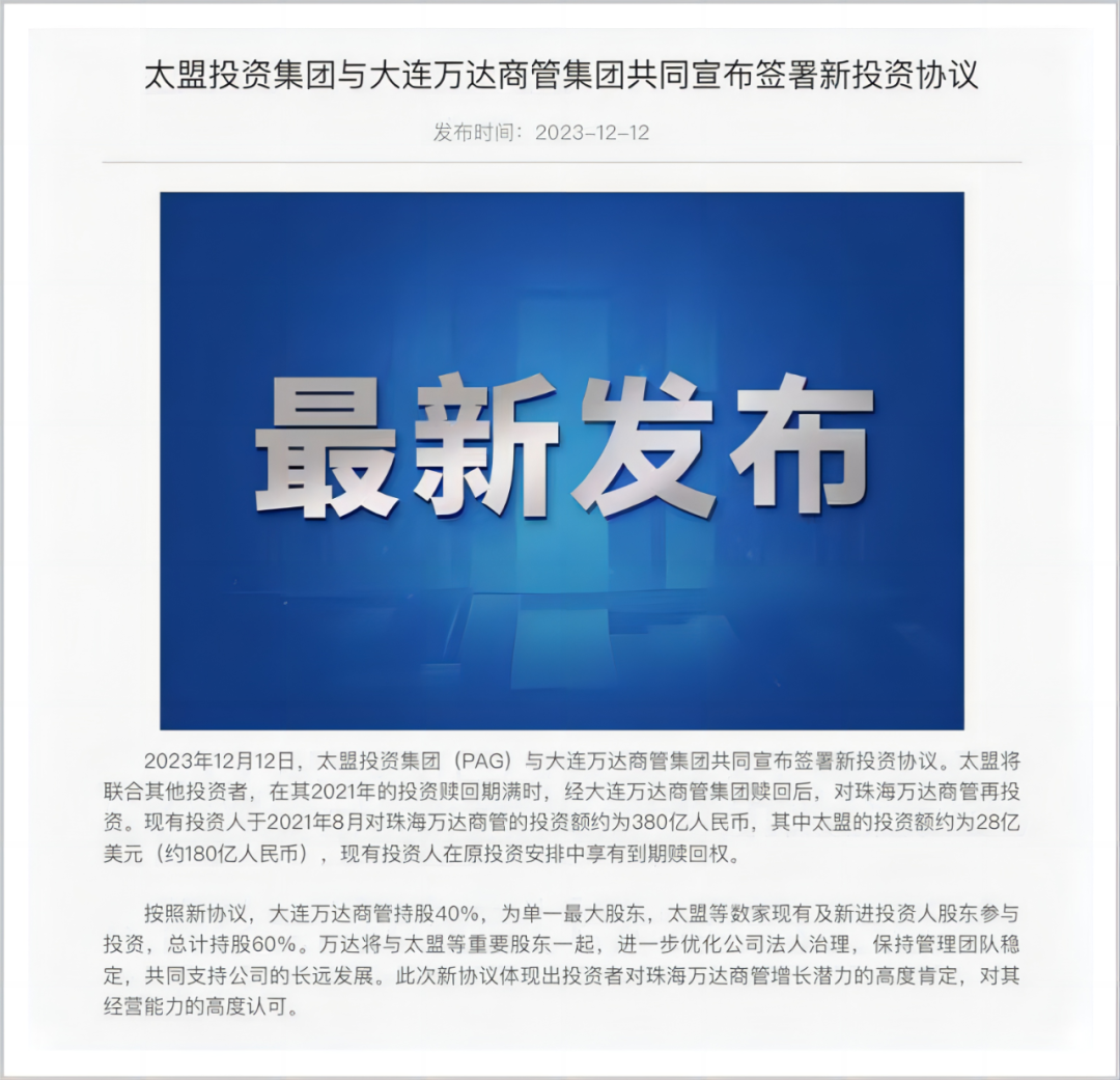 这一天,王健林“卖”掉了珠海万达商管的绝对控制权。他与投资者签订协议,让自己旗下的大连万达商管持有珠海万达商管的股权比例,从78%降到了40%。