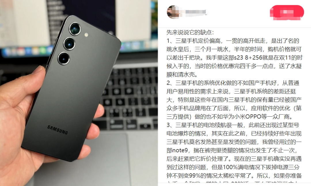 国产手机的崛起也很大地挤压了三星的市场空间。首先是随着国产品牌的增加,同质化产品有了不同价格区间的产品可供选择;三星手机平均售价上升到了2350元的水平,相较之下OPPO、vivo、小米都有2000元以下的智能机可供选择。在价格不占优势的条件下,三星手机的产品优势也不算明显,“我上大学的时候三星手机就有发烫、耗电量快的问题,到了现在我已经毕业快十年了这些问题仍旧没有改变,相较之下国产手机的质量是一直在进步的,我没必要还继续选择三星。”一位脱粉三星的用户这样说道。
