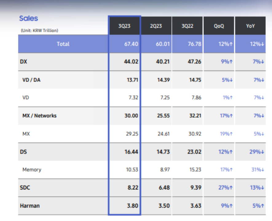 以细分业务来看,包含智能手机、智能电视等硬件设备销售的DX(设备体验)业务在2023年第三季度同比下降了7%。事实上,2023年三星每个季度的营收都在同比下降,第一、第二季度也分别下降了18%和22%。