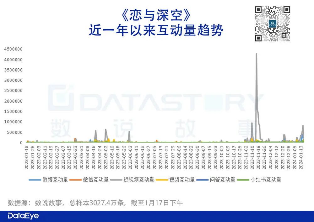 互动量:(赞、转、评、投币、收藏等)方面达到了3027万,主要集中在短视频平台,从时间维度来看,以二测期间为主,不少玩家根据游戏剧情进行二创,也有直接剧透剧情的,都获得了不少点赞和粉丝互动。