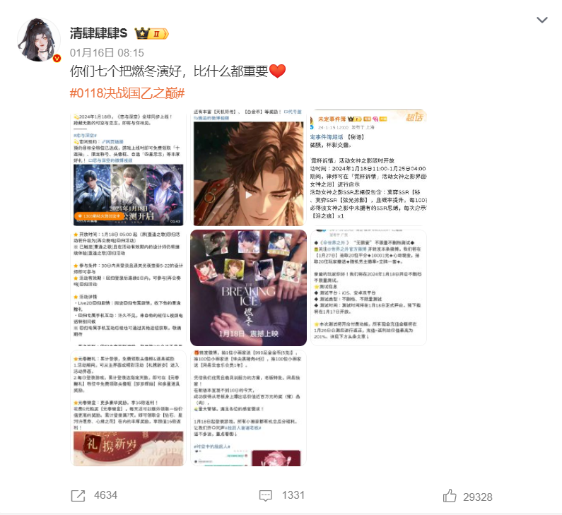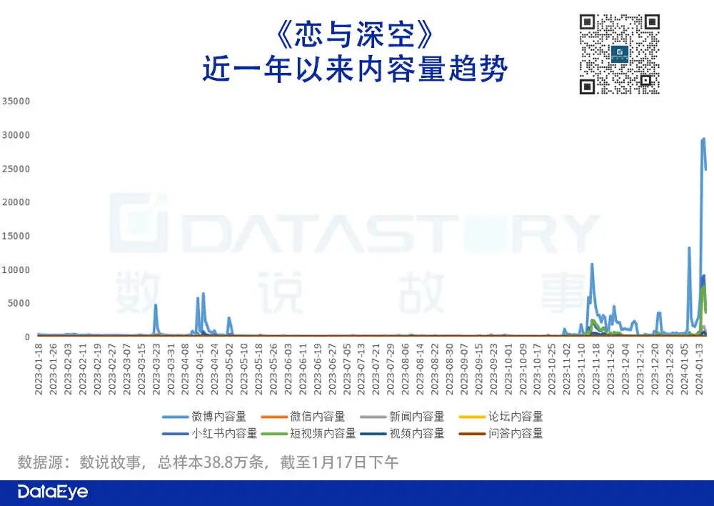 从内容数方面来看,微博是舆论主阵地。因为《恋与深空》官方推出转发内容抽5万元黄金活动,吸引不少用户转发内容参与,进而提升内容数。而短视频(主要是抖音)则是基于更多达人营销提供内容。