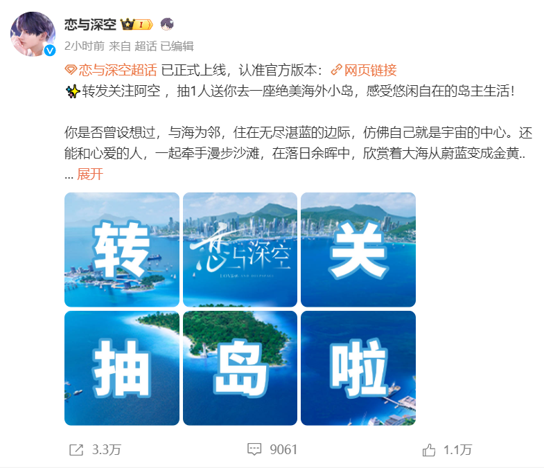 上线当天下午,官方发布转发、关注官方,抽取1人送海岛行。微博发布两小时后,已获得3万+转发,1万+点赞。