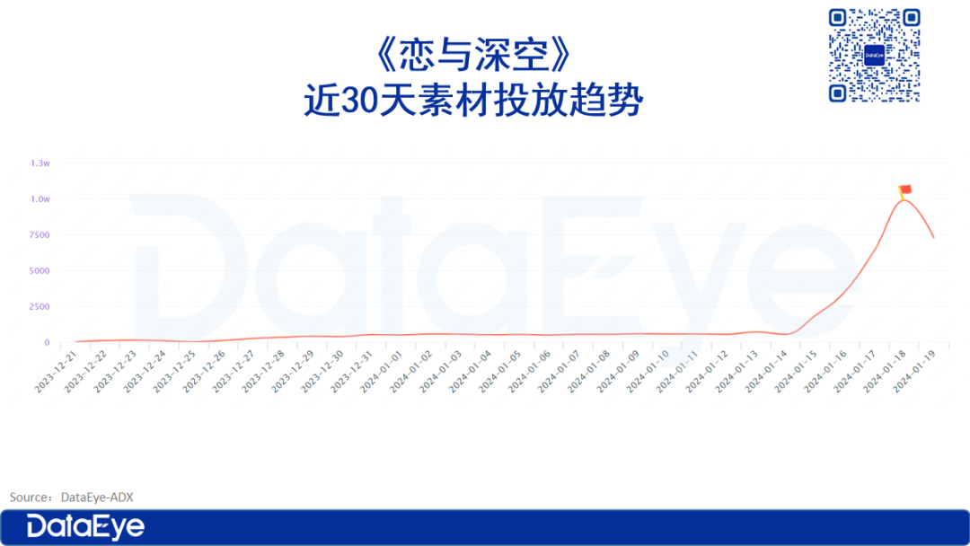 DataEye-ADX数据显示,《恋与深空》在今年十二月底才开始加大投放,日均投放视频+图片在500左右,上线前三天,继续加大投放力度,每日成倍递增,上线当天大规模投放,投放素材超过1万组。