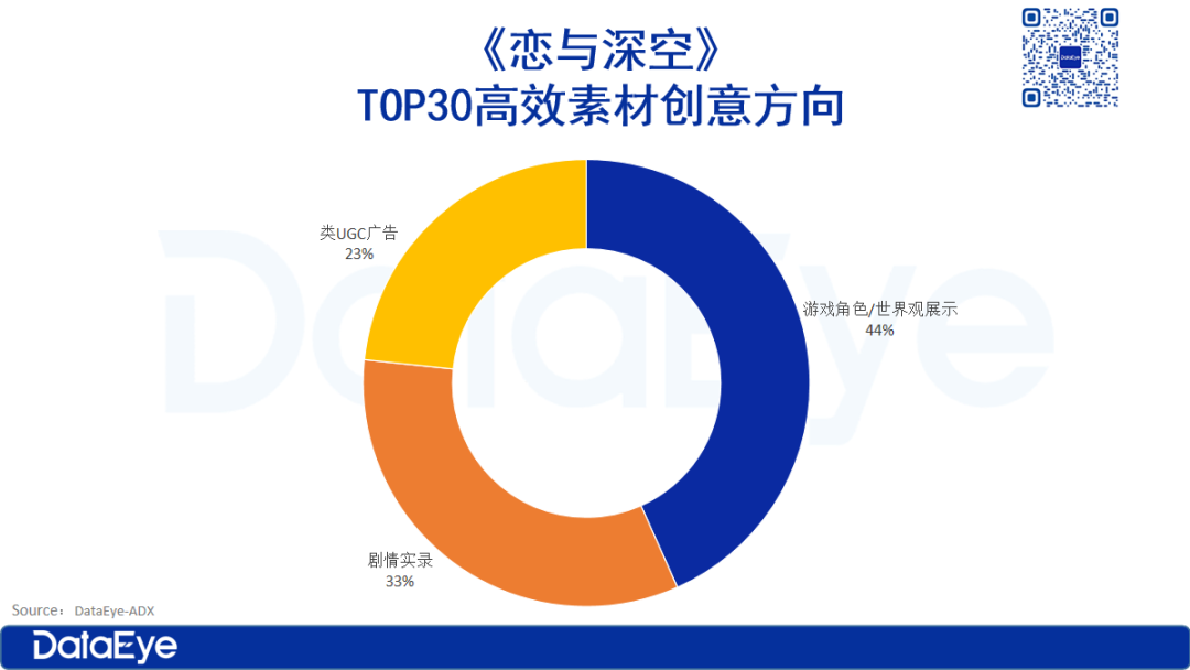 DataEye研究院整理了《恋与深空》投放计划数TOP30的高效素材,其投放素材创意形式中,“游戏角色/世界观展示”和“剧情实录”占比较高,达77%;类UGC广告达23%。