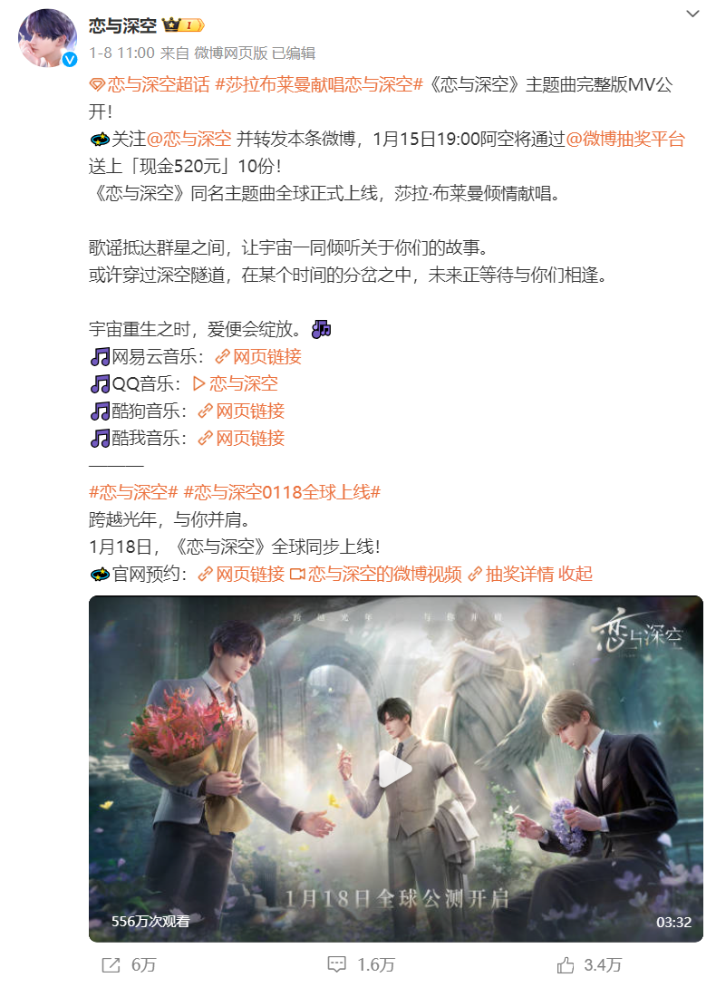 大手笔,全渠道营销,树大招风。《恋与深空》一测二测期间便多次登上微博热搜,上线当天线上线下齐发力,各个平台进行大量级社媒营销,包括平台品牌广告、品牌专题、上线激励机会、营销活动(预约奖励、兑换码、互助奖励)等内容式宣传等。