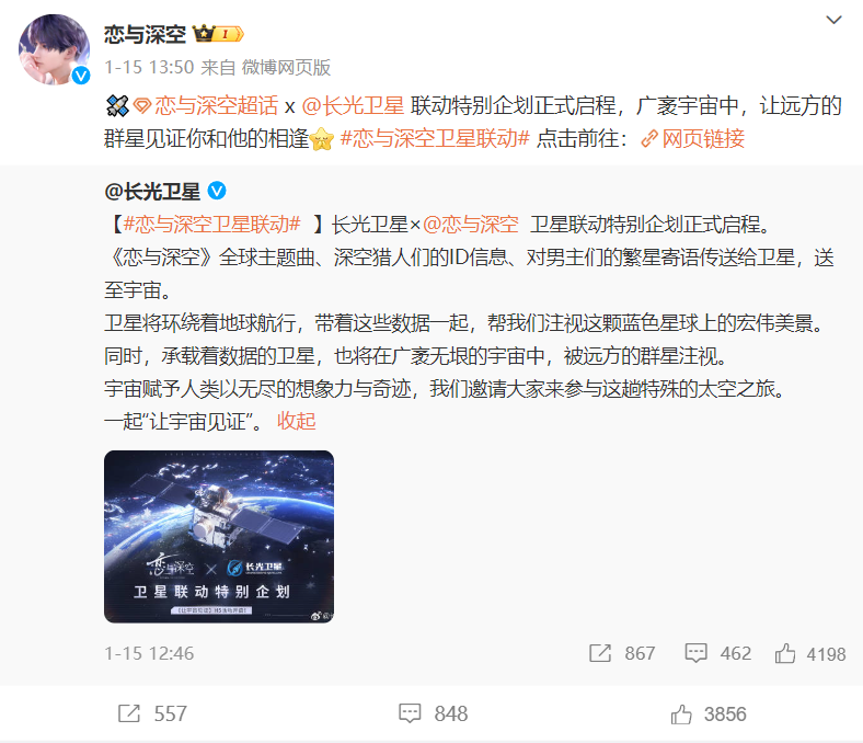 1月15日,项目组联动长光卫星开启特别企划,填写心动寄语,并生成专属纪念船票。《恋与深空》同名主题曲、深空猎人们的ID信息与心动寄语,都将随着合作卫星一起升空。