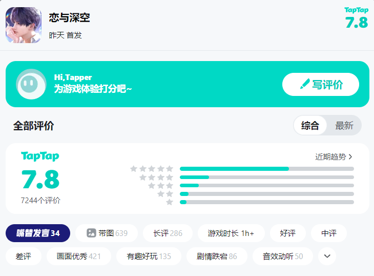玩家反馈方面,目前《恋与深空》的TapTap评分7.8分,评论7244条。