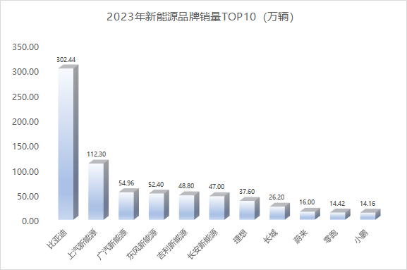 2023年,比亚迪以302.44万辆坐稳榜一位置,与第二名的上汽新能源甩开了190万辆的差距,随后是几家传统车企的新能源品牌,均徘徊在50万量级左右的位置,分别是广汽新能源、东风新能源、吉利新能源以及长安新能源。