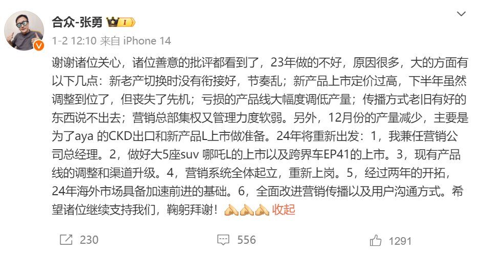 2024年刚开年,哪吒汽车CEO张勇在微博公开检讨“2023年做的不好”,主动提出短板并提出了诸多改进举措,不难看出哪吒汽车在2024年“重新起飞”的决心。