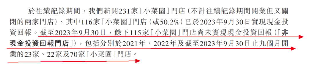 招股书称,于往绩记录期间,小菜园新开231家门店(编者按:不计往绩记录期间开业但又关闭的两家门店)。截至2023年9月30日,有115家小菜园门店尚未实现现金投资回报。