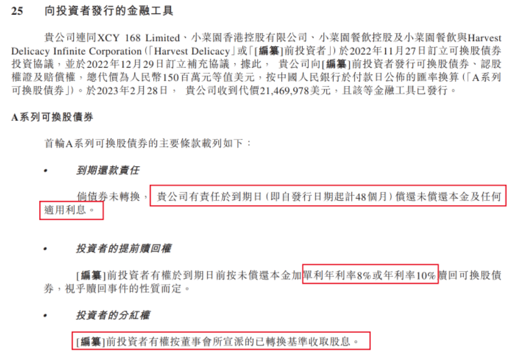不仅如此,这笔债券享有分红权。这也意味着,上市之前,加华资本已经在小菜园此前的分红中获得回报。