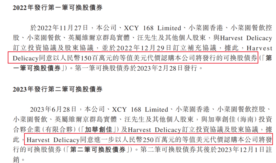 2023年6月,Harvest Delicacy同意进一步以2.5亿元等值美元代价认购小菜园第二笔可换股债券。