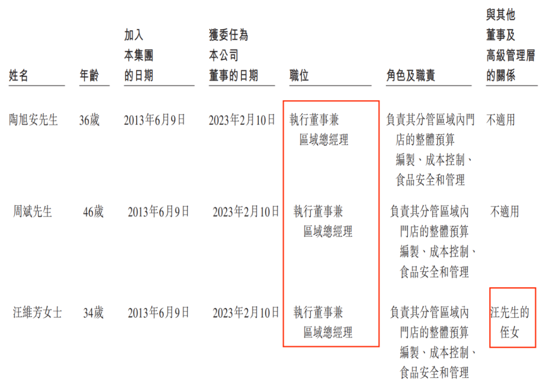 其中,周斌曾是和谐餐饮的行政总厨,陶旭安曾担任汪旺美食厨师长、和谐餐饮行政总厨,汪维芳曾担任和谐大酒店经理、和谐餐饮经理。不仅如此,汪维芳还是汪书高的侄女。