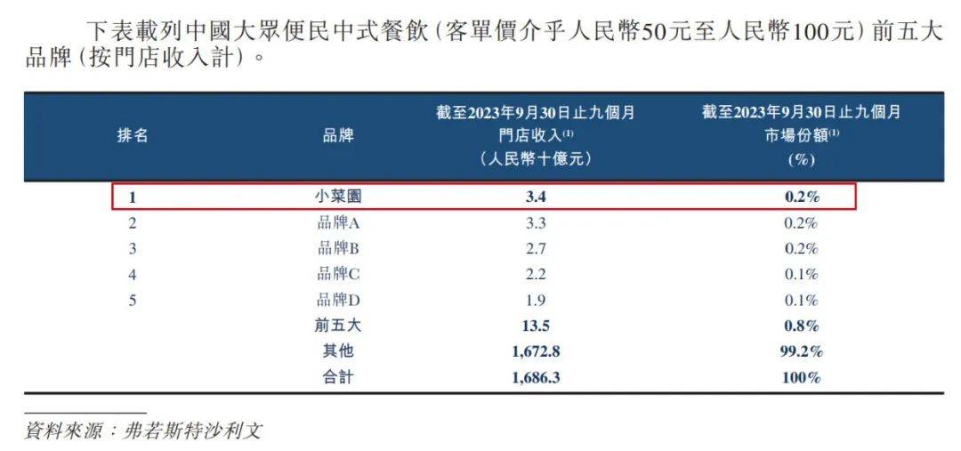 这是一家新派徽菜连锁品牌,深耕大众便民中式餐饮。弗若斯特沙利文资料显示,在客单价介乎50元至100元的中国大众便民中式餐饮市场的所有品牌中,小菜园排名第一(按截至2023年前9月的门店收入计),且市场份额为0.2%。