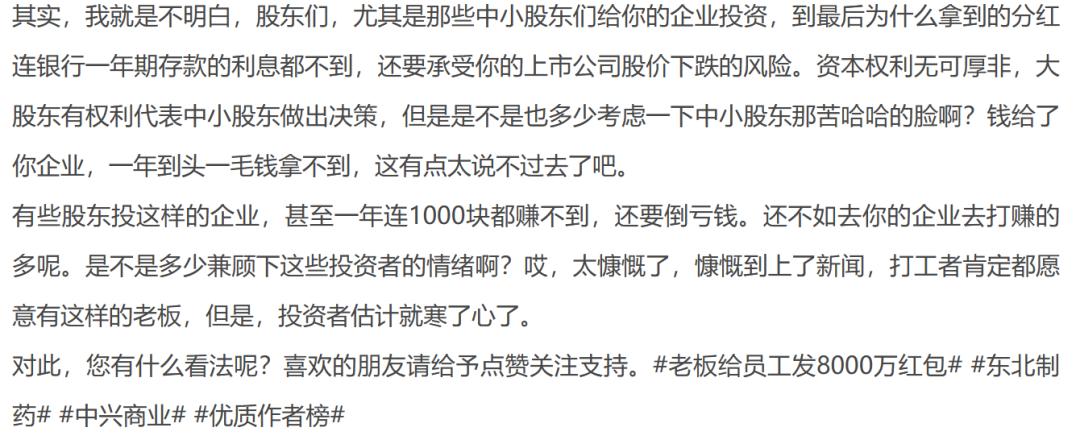 但听到这样的消息,与欢欣鼓舞的东北制药、中兴商业员工不同,股民们可开心不起来。甚至有股民发帖问,“给投资者发了多少红包?现在全国股民都在抑郁。”