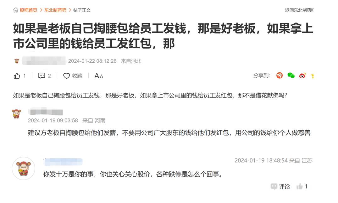 在上述发红包消息公布后,东北制药的某论坛上,投资者们开始纷纷讨论此事,有投资者建议方老板也关心一下股价,“考虑一下中小股东那苦哈哈的脸”。
