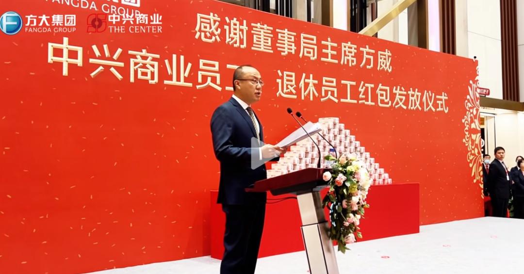 视频显示,仪式现场摆放着一摞高高的现金墙,员工依次上台领取了自己的现金红包。红色的背景板上,写着“感谢董事局主席方威——中兴商业员工、退休员工红包发放仪式”几个大字。