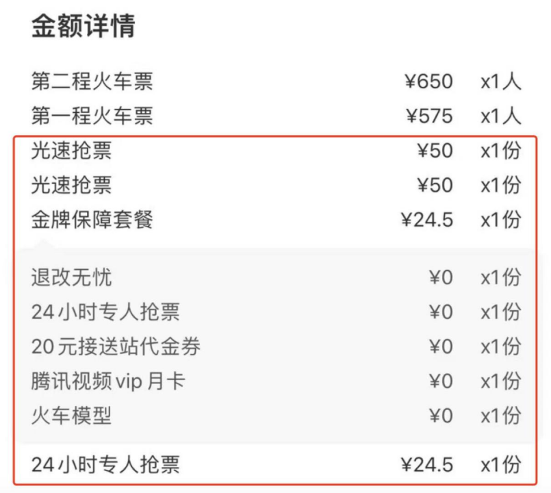 面对春运期余票不多时,人们自动会处于精神紧绷、靠下意识做出决定的状态,这些“隐藏项目”常被连带勾选。