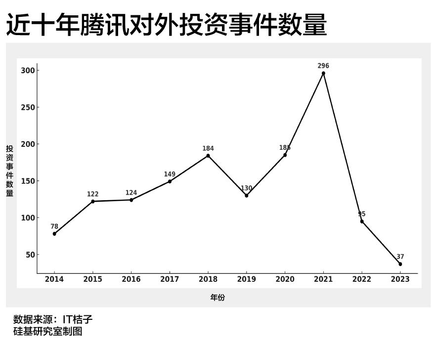 以腾讯为例,2023年腾讯对外投资出手事件数量下跌至37起,同比减少了 60%,这也是腾讯近十年投资历史上的最低点。