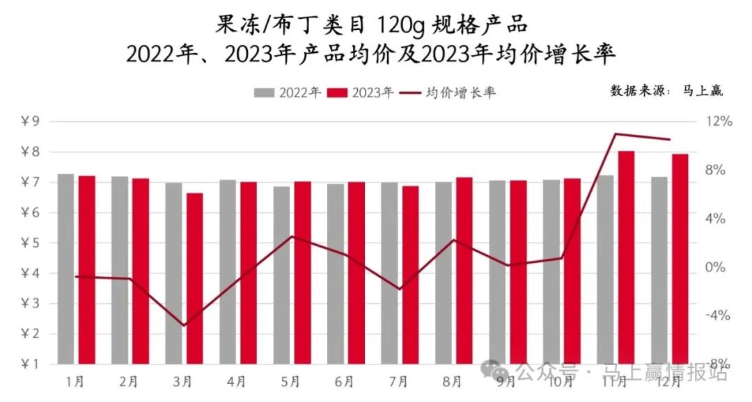 基于马上赢线下零售监测网络中的相关数据,果冻/布丁类目内较有代表意义的120g规格产品的均价增长率在全年大部分时间也均为正,且在第四季度迎来了一波上扬。