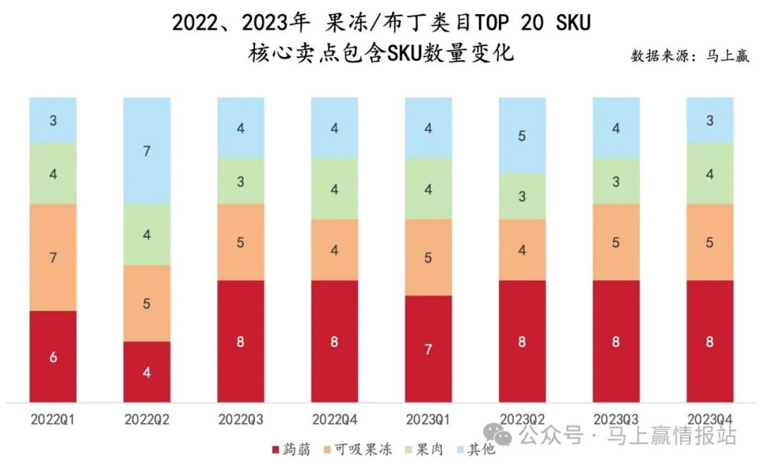 为了更清晰的看到“蒟蒻”风何时在类目中刮起,基于马上赢线下零售监测网络中的相关数据,我们拉取了2022、2023两年Q1-Q4共8个季度,果冻/布丁类目内的销售TOP20产品,并通过分析类目内各个卖点包含的SKU数量、各卖点产品中位价、各卖点下产品所占市场份额变动情况等维度对“蒟蒻”这一概念进行进一步的分析。