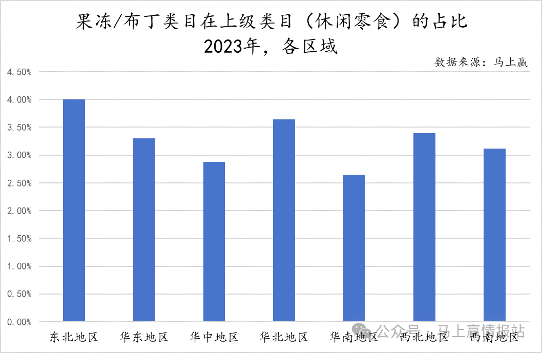类目在各业态中的上级类目消费占比上,可以看到在大卖场、大超市等典型大业态中,果冻/布丁类目在上级类目中的占比显著偏高,可见以家庭采购为主要消费动机的大业态在与果冻/布丁的典型消费场景契合度更高。相比来说,在便利店的休闲零食消费中,果冻/布丁类目的产品消费偏低,其占比相较大卖场中的占比低了近一倍。