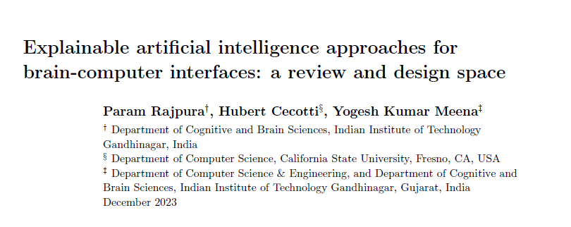 Rajpura, Param, Hubert Cecotti, and Yogesh Kumar Meena. "Explainable artificial intelligence approaches for brain-computer interfaces: a review and design space." arXiv preprint arXiv:2312.13033 (2023). https://arxiv.org/abs/2312.13033