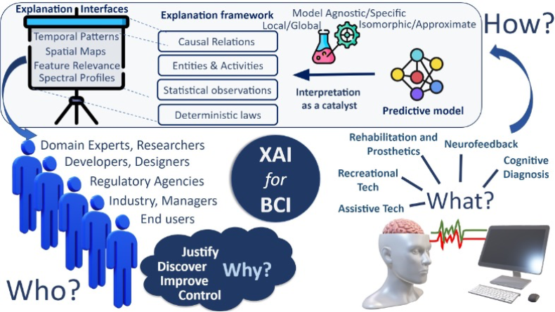 对于脑机接口而言,这意味着需要将复杂的神经科学和机器学习原理翻译成可视化、直观和容易理解的信息。不同的解释界面和技术各自扮演着独特的角色,以帮助不同的利益相关者理解和信任脑机接口技术: