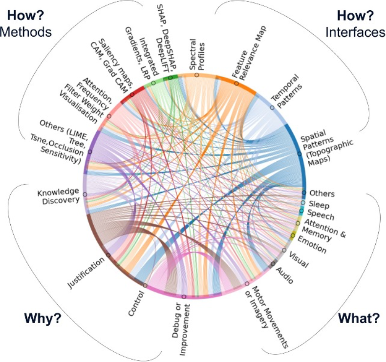 上文中,我们讨论了这些用于脑机接口的基元:脑机接口的驱动力(“为什么”)、利益相关者(“谁”)、应用领域(“是什么”)、界面(“如何做”)。结合这些元素,就可以构建一个全面的、以人为中心的XAI4BCI设计空间,以适应和促进“人在回路”的脑机接口,进而实现下一步技术飞跃。图6利用和弦图*(chord diagram)帮助我们直观地了解XAI4BCI的设计空间变量。
