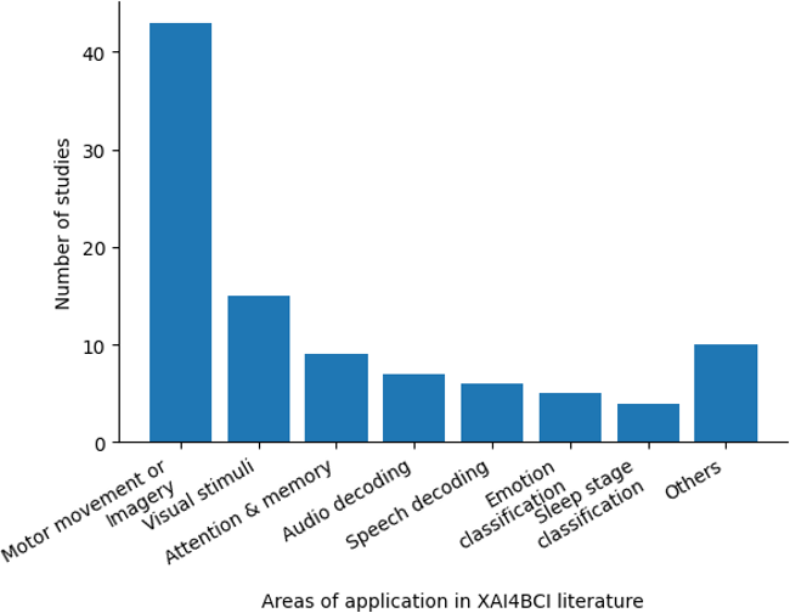 ▷图4:采用可解释人工智能进行脑机接口认知任务的趋势。在可解释性方面,运动和图像是脑机接口最多的研究领域之一。