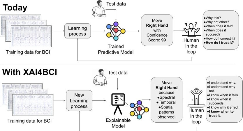 为解决这个问题,印度理工学院Yogesh Kumar Meena领衔的研究团队提出了一种新的思路:应用于脑机接口的可解释人工智能技术(XAI4BCI)。他们试图将人工智能的解释能力与大脑信号结合,让我们能更直观地理解脑机接口,让这门技术不再是科学家的专属,而是融入每个人的生活。