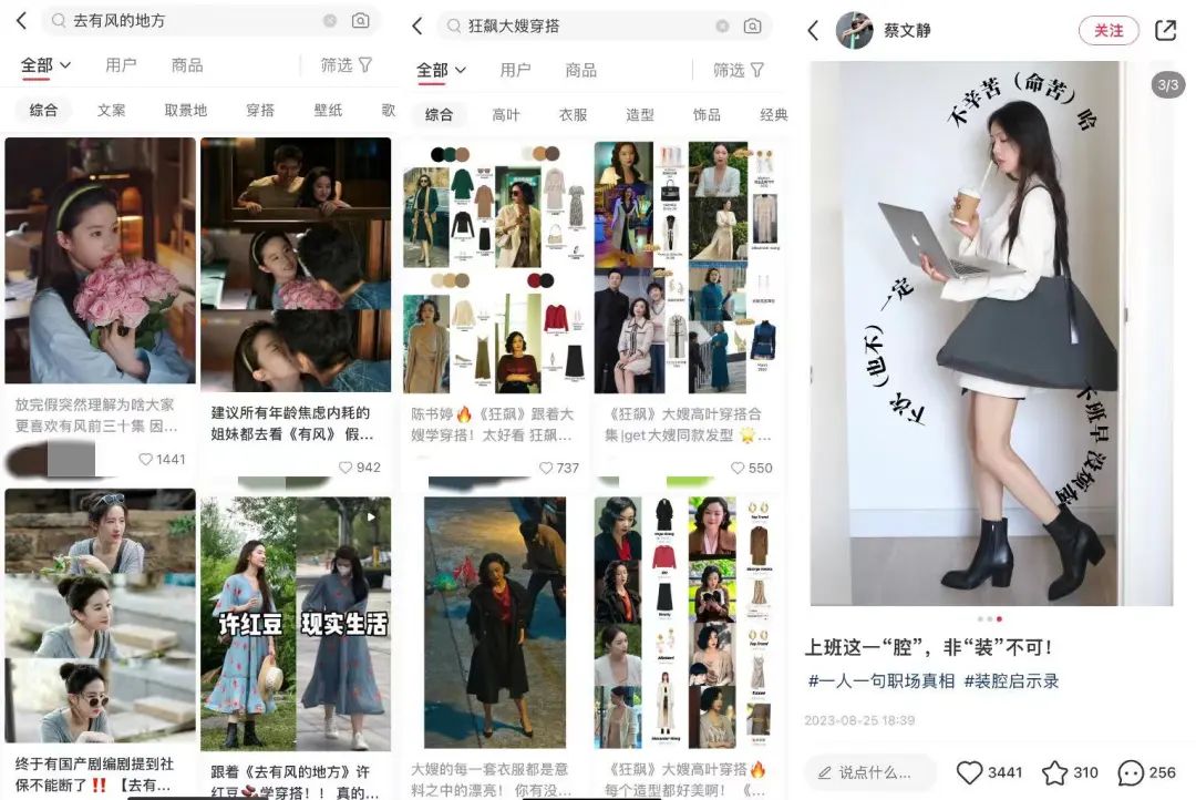 除了必选项微博和冉冉升起的抖音外,近两年在娱乐内容上开始发力的小红书也进入剧集宣传的视野。年初《去有风的地方》在小红书上走红,还因此得名“小红书剧”,《狂飙》里“大嫂”的穿搭在小红书上引起广泛讨论,《装腔启示录》播出期间,多位主创人员也都入驻小红书,分享拍摄经历。![]()