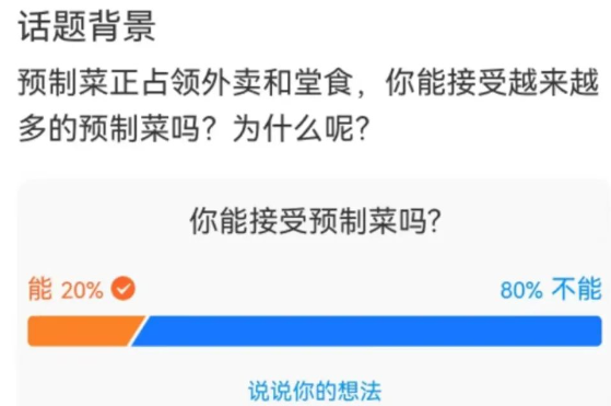 在某平台发起的热点话题调查中,面对“外卖和堂食里预制菜越来越普及,你能接受预制菜吗”这个问题,95.9万参与者中有80%选择了“不能”。