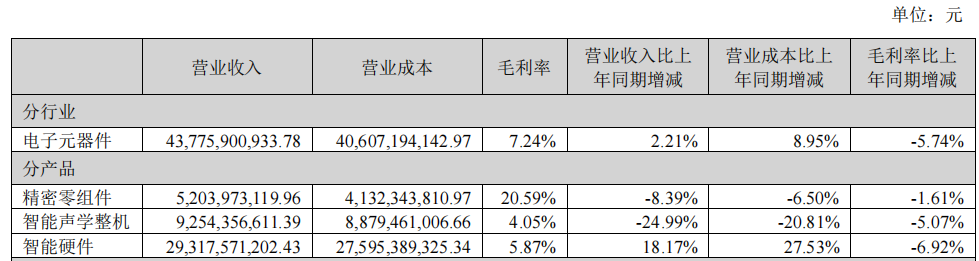 歌尔股份第三大业务精密零组件业务也因为消费电子行业不景气,出现营收和毛利率双双下滑。