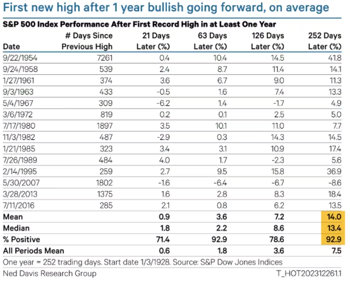 与此同时,Ned Davis Research策略师埃德·克利索德(Ed Clissold)指出,历史数据显示,当股市在时隔至少1年之后重返创纪录区域时,1年后的回报为正。