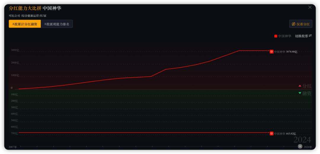 更需要指出的是,中国神华除了IPO上市时募资665.82亿元之后,再无任何新的融资动作。公司每年保持分红次,A+H累计为股东分享 3711.94 亿元 ,其中A股分红3078.88 亿元。