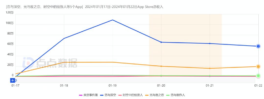 1 月 18 日被玩家们戏称为决战国乙之巅,两款新游叠纸《恋与深空》、网易《世界之外》上线,腾讯、米哈游、灵犀互娱旗下的热门女性向游戏都有大活动开放。