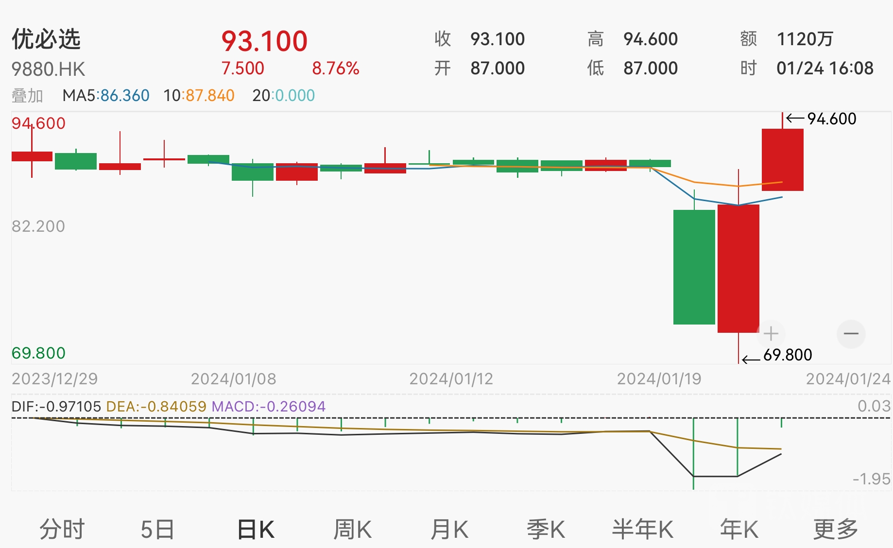 截至1月24日港股收盘,优必选股价报收93.1港元,涨8.76%,成交额为1119.78万港元,当前公司总市值约389.29亿港元。