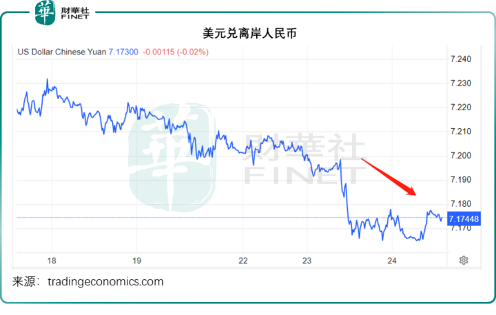 离岸资金驰援的消息,或也带动离岸人民币兑美元汇率上涨,兑美元汇价已超越7.18,见下图,在一周前,离岸人民币兑美元还在7.23以上——注:数值越低,1美元能兑换的离岸人民币越少,意味着离岸人民币兑美元走强。