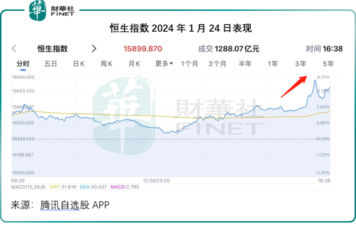 受此消息带动,港股1月24日尾盘忽然急拉,见下图。