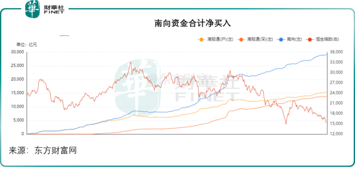从目前港股市场的资金走向来看,南向资金在继续增援,见下图,恒生指数持续向下,而南向资金依然在攀升。但从港股市场的整体日成交量来看,未算太活跃,外资似乎仍按兵不动。