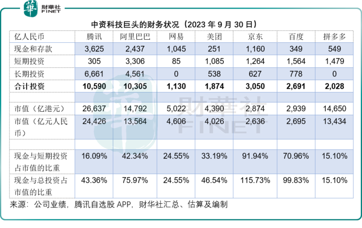 再来看获创始股东大幅增持的阿里巴巴,阿里巴巴是中国科网股中回购力度最大的。于2023年9月末,阿里巴巴的现金与短期投资合共有5,743.6亿元人民币,长期投资达到4,561.09亿元人民币,现金与投资合共达到1.03万亿元人民币,相当于其当前H股市值1.48万亿港元的75.97%,可见阿里巴巴仍有足够的“弹药”回购和进行投资。