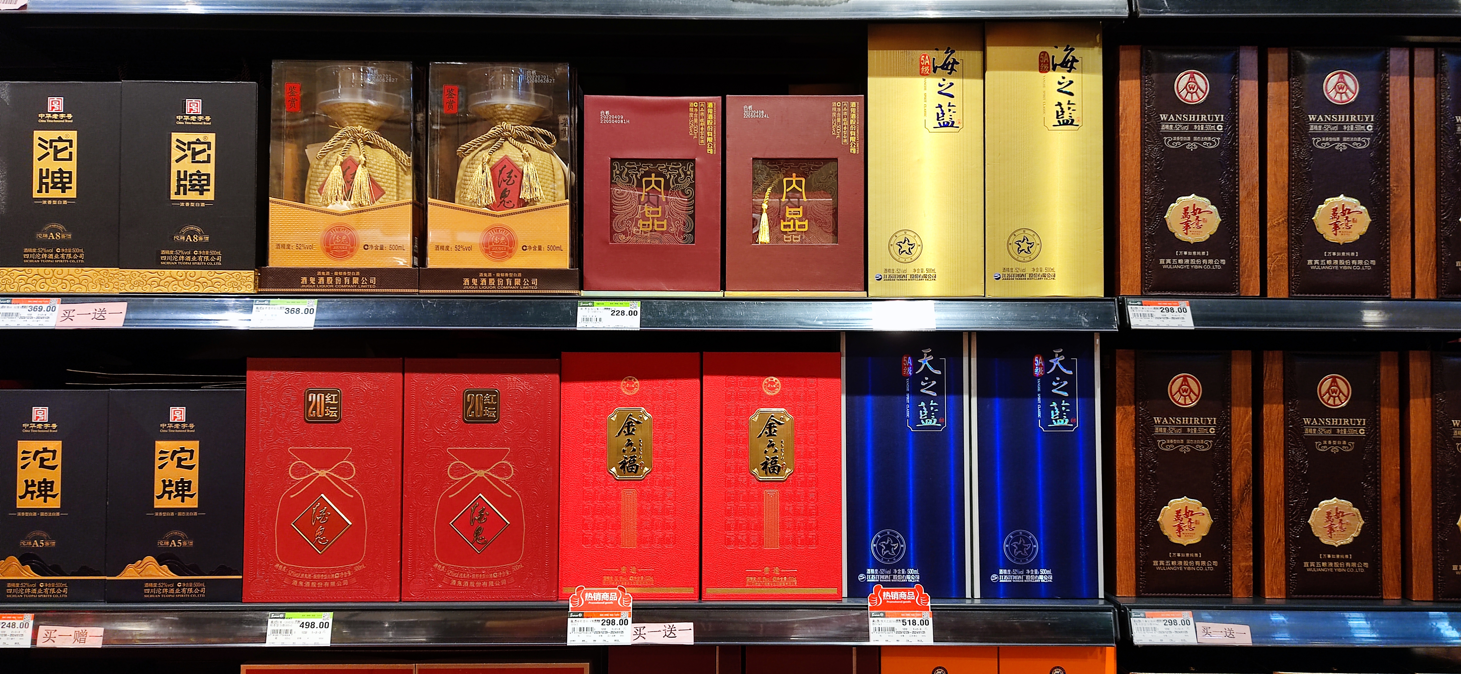 此外,二三线白酒品牌集中为舍得、水井坊、泸州老窖、红花郎等,春节促销活动多为扫码赢红包、赢金条等,价格上也享受会员折扣价。比较明显的是,终端促销活动大都集中在200-400元档位,这个价位段的部分白酒在KA商超最大优惠力度可达到“买一送一”。