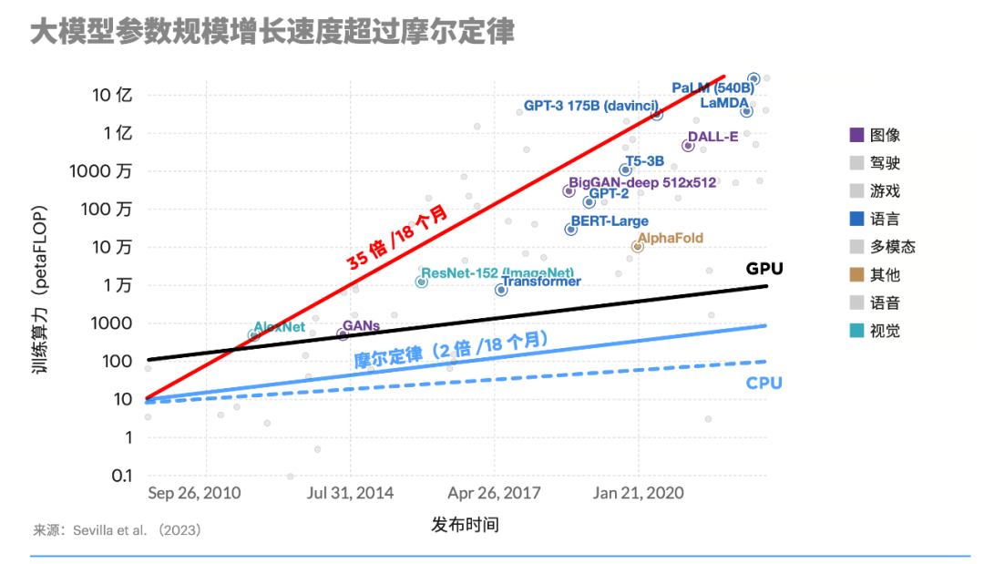 既然AI芯片这么重要,那为什么还会如此短缺?归根到底,AI芯片的性能提升仍然受限于摩尔定律,远远赶不上大模型参数的规模增长。