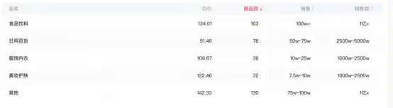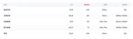 而董宇辉直播间的食品饮料、日用百货、生鲜蔬果、图书音像、其他的品类均价皆不到100元。