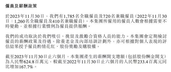 增收不增利的背后不仅有销售及营销开支的加大,东方甄选为了绑定员工而增加的股份酬金开支也在猛增。去年6月到11月,东方甄选的薪酬开支总额(包括股份酬金开支)大幅增长167.7%至6.25亿元。