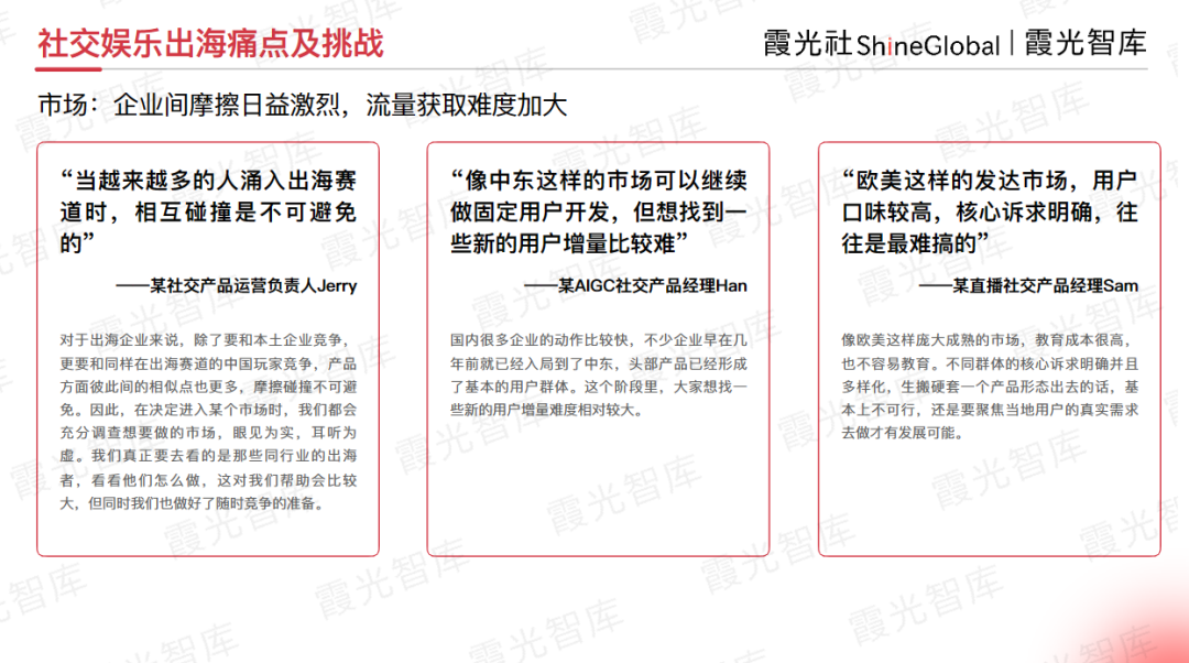 即便如此,随着国内市场流量红利见顶、海外市场在多个维度的吸引力倍增,仍然有大批新兴企业选择远航。某社交产品运营负责人Jerry透露,“当越来越多的人涌入出海赛道时,相互碰撞是不可避免的。”