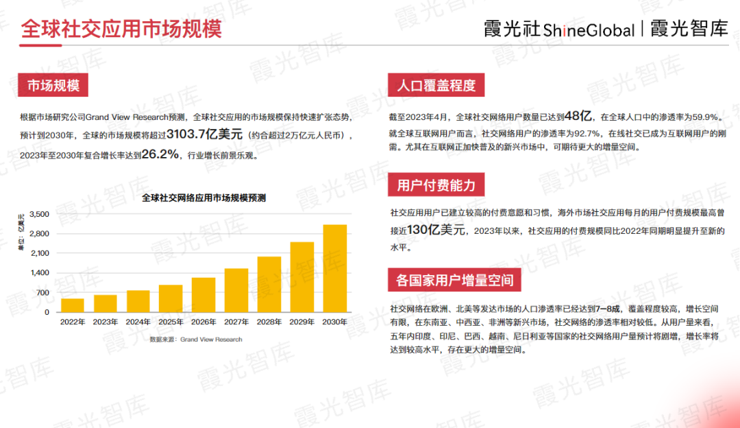 根据市场研究公司Grand View Research预测,预计到2030年,全球社交应用的市场规模将超过3103.7亿美元(约合人民币2万亿元)。截至2023年4月,全球社交网络用户数量已达到48亿,在全球人口中的渗透率为59.9%。就全球互联网用户而言,社交网络用户的渗透率为92.7%,在线社交已成为互联网用户的刚需。