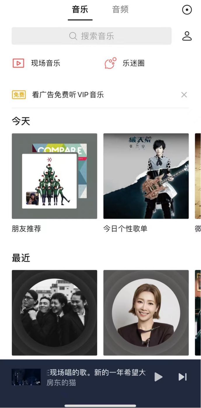 点开“听一听”中的“音乐”选项,页面头部出现的是“现场音乐”和“乐迷圈”,这两项功能都和视频号紧紧绑定。